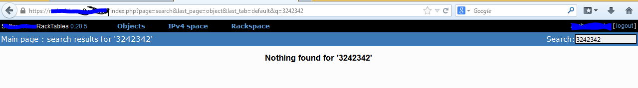 This is the query used: SELECT id FROM RackObject WHERE asset_no LIKE '%3242342%' ORDER BY asset_no; If that doesn't return the row, there is something wrong with your MySQL server. |