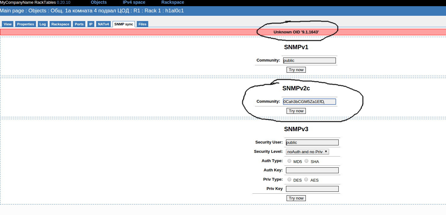 | Provide more info: http://wiki.racktables.org/index.php/FAQ#Why_does_the_SNMP_sync_feature_return_Unknown_OID_.28n.n.n.n.n.29 | |