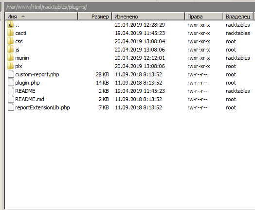 | Description | Trying to install plugin for custom reports as I need report as much as possible. Using manual from this link: https://github.com/lrupp/racktables-reports. Steps as follow: 1. I copied the files from the /reports/ folder to /var/www/racktables/html/racktables/plugins/ (using WinSCP) 2. Try to Activate the plugin via the Configuration => Plugins menu. -> The problem is there is no any plugin (except default Cacti and Munin) | ||||