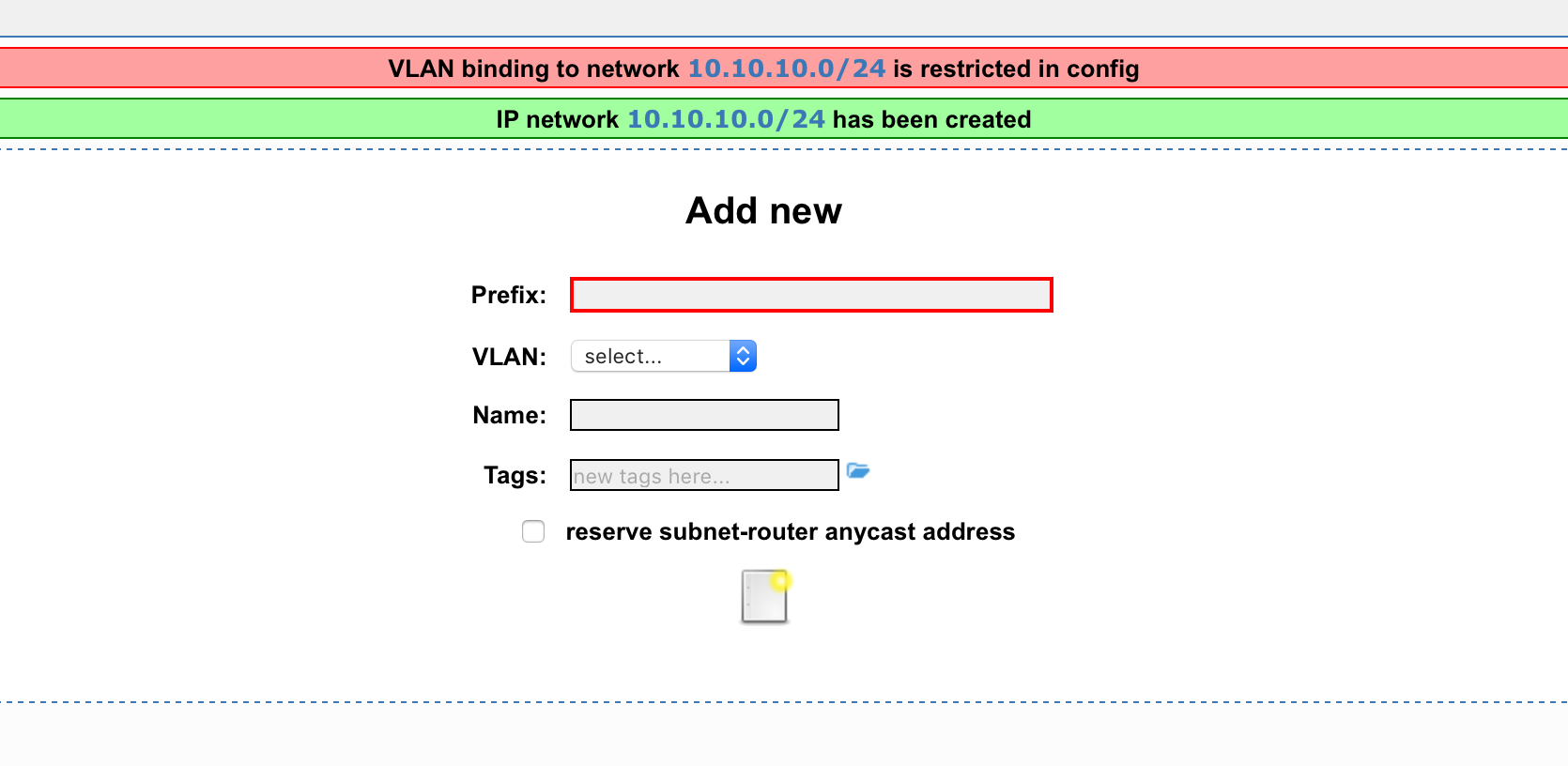 | Description | Not able to add an IP network with vlan ID. I have tried multiple VLAN IDs and IP address combo's | ||||