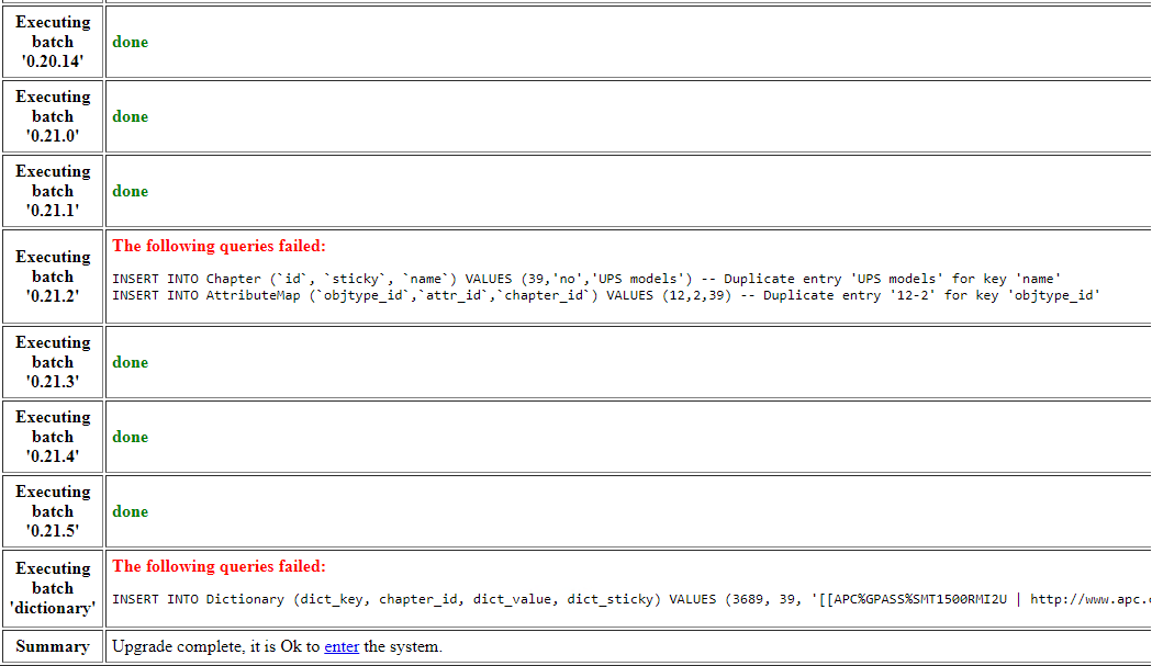 | Additional Information | Executing batch '0.21.2' The following queries failed: INSERT INTO Chapter (`id`, `sticky`, `name`) VALUES (39,'no','UPS models') -- Duplicate entry 'UPS models' for key 'name' INSERT INTO AttributeMap (`objtype_id`,`attr_id`,`chapter_id`) VALUES (12,2,39) -- Duplicate entry '12-2' for key 'objtype_id' Executing batch 'dictionary' The following queries failed: INSERT INTO Dictionary (dict_key, chapter_id, dict_value, dict_sticky) VALUES (3689, 39, '[[APC%GPASS%SMT1500RMI2U | http://www.apc.com/products/resource/include/techspec_index.cfm?base_sku=SMT1500RMI2U]]', 'yes'), (3690, 39, '[[APC%GPASS%SMT1500RMI2UNC | http://www.apc.com/products/resource/include/techspec_index.cfm?base_sku=SMT1500RMI2UNC]]', 'yes'), (3691, 12, '[[NETGEAR%GPASS%GS108 | https://www.netgear.com/business/products/switches/unmanaged/GS108.aspx]]', 'yes'), (3692, 12, '[[NETGEAR%GPASS%GS105 | https://www.netgear.com/business/products/switches/unmanaged/GS105.aspx]]', 'yes'), (3693, 13, '[[PROXMOX%GSKIP%Proxmox VE 3.4 | http://pve.proxmox.com/wiki/Roadmap#Proxmox_VE_3.4]]', 'yes'), (3694, 13, '[[PROXMOX%GSKIP%Proxmox VE 4.0 | http://pve.proxmox.com/wiki/Roadmap#Proxmox_VE_4.0]]', 'yes'), (3695, 13, '[[PROXMOX%GSKIP%Proxmox VE 4.1 | http://pve.proxmox.com/wiki/Roadmap#Proxmox_VE_4.1]]', 'yes'), (3696, 13, '[[PROXMOX%GSKIP%Proxmox VE 4.2 | http://pve.proxmox.com/wiki/Roadmap#Proxmox_VE_4.2]]', 'yes'), (3697, 13, '[[PROXMOX%GSKIP%Proxmox VE 4.3 | http://pve.proxmox.com/wiki/Roadmap#Proxmox_VE_4.3]]', 'yes'), (3698, 13, '[[PROXMOX%GSKIP%Proxmox VE 4.4 | http://pve.proxmox.com/wiki/Roadmap#Proxmox_VE_4.4]]', 'yes'), (3699, 13, '[[PROXMOX%GSKIP%Proxmox VE 5.0 | http://pve.proxmox.com/wiki/Roadmap#Proxmox_VE_5.0]]', 'yes'), (3700, 13, '[[PROXMOX%GSKIP%Proxmox VE 5.1 | http://pve.proxmox.com/wiki/Roadmap#Proxmox_VE_5.1]]', 'yes'), (3701, 12, '[[TP-Link%GPASS%T1600G-18TS | https://www.tp-link.com/en/products/details/cat-40_T1600G-18TS.html]]', 'yes'), (3702, 27, '[[Raritan%GPASS%PX3-5514U | http://cdn.raritan.com/product-selector/pdus/PX3-5514U/MPX3-5514U.pdf]]', 'yes'), (3703, 12, '[[HP Aruba%GPASS%3810M 16SFP+ 2-slot (JL075A) | http://duckduckgo.com/?q=JL075A+manual ]]', 'yes'), (3704, 13, 'VMWare Hypervisor%GSKIP%VMware ESXi 6.5', 'yes'), (3705, 17, '[[ Fortinet%GPASS%Fortigate 600D | http://www.fortinet.com/content/dam/fortinet/assets/data-sheets/FortiGate_600D.pdf ]]', 'yes'), (3706, 13, 'Ubuntu%GSKIP%Ubuntu 18.04 LTS', 'yes'), (3707, 12, 'MikroTik%GPASS%CRS328-4C-20S-4S+RM', 'yes'), (3708, 12, 'MikroTik%GPASS%CRS328-24P-4S+RM', 'yes'), (3709, 13, '[[Debian%GSKIP%Debian 9 (Stretch) | http://debian.org/releases/stretch/]]', 'yes'), (3710, 12, 'Arista%GPASS%7170-32C', 'yes'), (3711, 12, 'Arista%GPASS%7170-64C', 'yes'), (3712, 12, 'Arista%GPASS%7060SX2-48YC6', 'yes'), (3713, 12, 'Arista%GPASS%7260CX3-64', 'yes') -- Cannot add or update a child row: a foreign key constraint fails (`racktables_v20_8`.`Dictionary`, CONSTRAINT `Dictionary-FK-chapter_id` FOREIGN KEY (`chapter_id`) REFERENCES `Chapter` (`id`)) Summary Upgrade complete, it is Ok to enter the system. | ||||