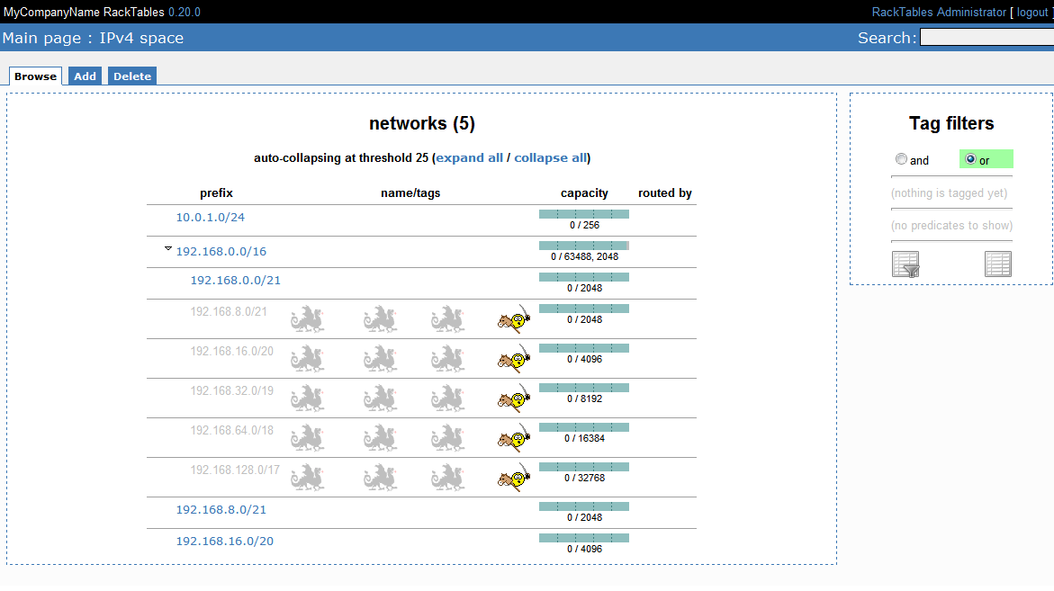 No I did a fresh checkout of racktables this morning, created the database, installed it to a secondary directory, added the subnets, and did the screenshot. Without any modifications, plugins or source code hacks. On the server itself there is nothing special I can remember. ESXi guest, apache2, php5, mysql-server, vmware-tools, required libs for racktables, disabled port 80 and permanently redirected to 443 only, access through IP address only ... very bare. 0.19.13 is currently productive on it without any problems. I can provide a `git status` after weekend. Are there any other debug options available in RT or spots I could have a look at? Edit: access and error logs are free of errors for sure :) |